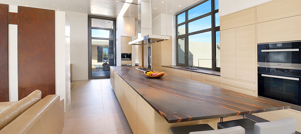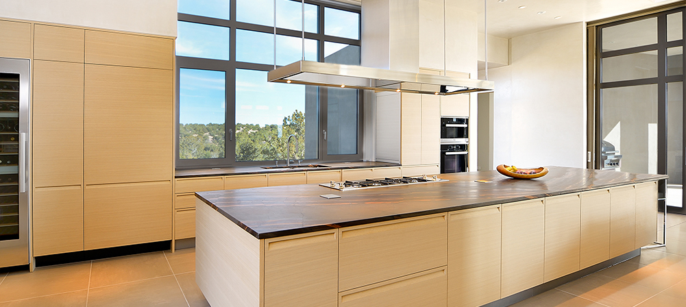 The clear, bright atmosphere of New Mexico’s high desert is reflected in the light rift oak of this Minimal Kitchen. Low profile handles provide clean lines without sacrificing utility.
