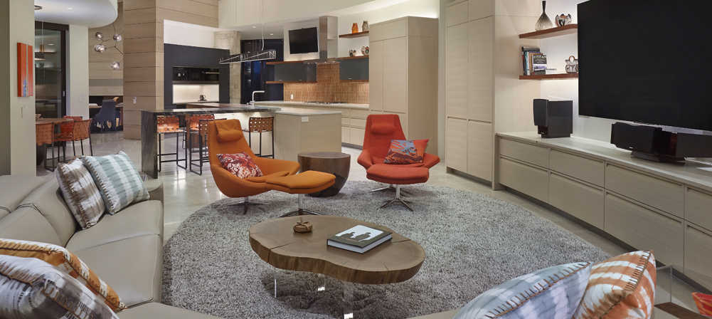 This Desert Modern Remodel required a large amount of technical coordination to properly address the array of curvilinear forms. The Minimal Kitchen wraps around the central wall into both Living Room and Entry Way, showcasing the versatility of the cabinet structure as well as the richness of the Natural Oak.